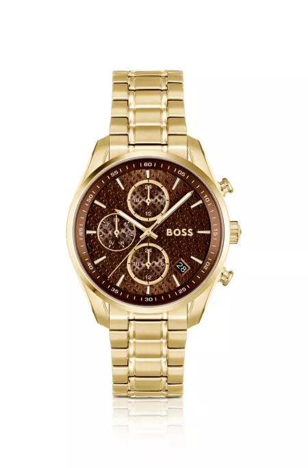 With domed glass, a leather strap and gold-tone steel, this BOSS Menswear watch elevates any look. Slimline tachymeter bezel. Panda-style twin subeyes.
