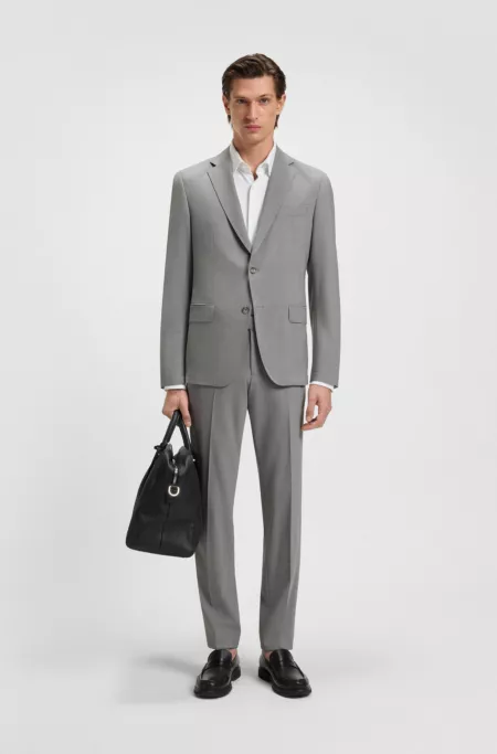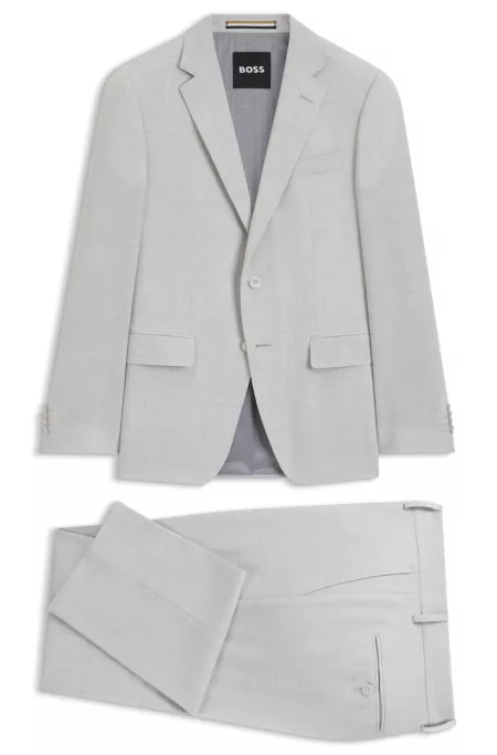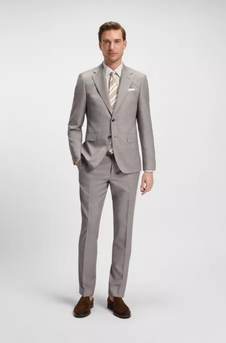 Create a range of formal looks with this easy-care BOSS Menswear suit. Offered in a slim fit for clean lines, this ensemble is crafted in washable fabric made with virgin wool and stretch for a soft feel with dependable crease resistance. The fabric is woven with a subtle pattern.