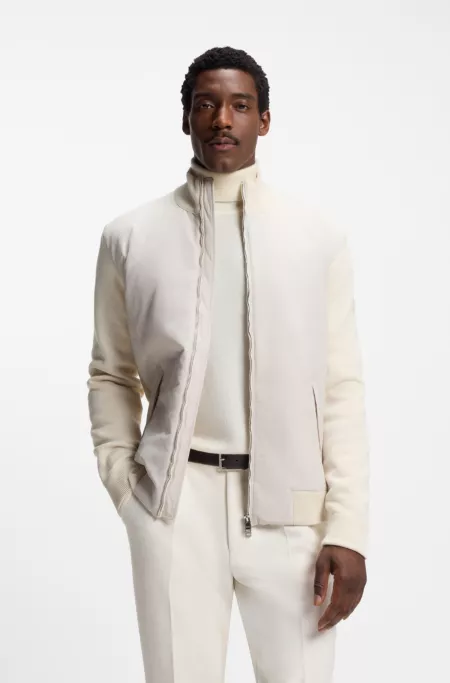Combining a soft wool knit with cozy down quilting, this hooded BOSS Menswear jacket will become a daily favorite. Straight fit.