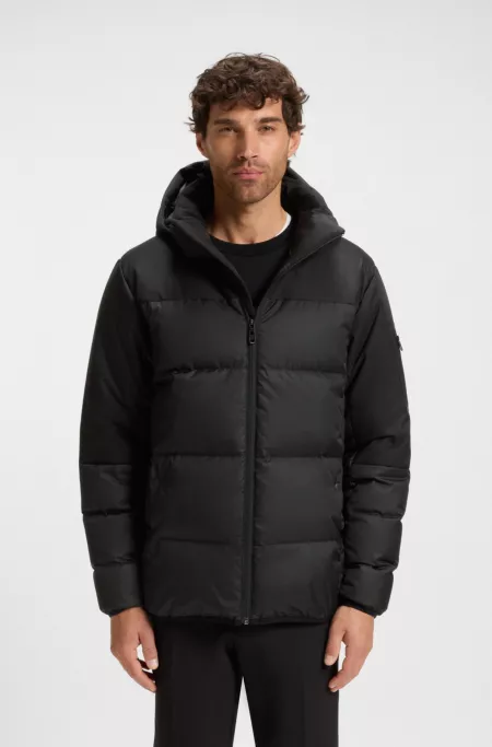 An innovative jacket by BOSS, filled with certified duck down and feather for lightweight warmth. This water-repellent design features a detachable hood.