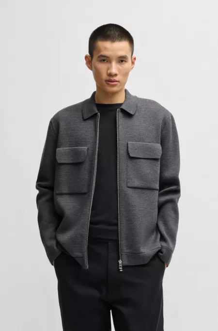 A modern cardigan with a two-way zip by BOSS Menswear. This piece is cut to a straight fit in super-soft wool with flap pockets.
