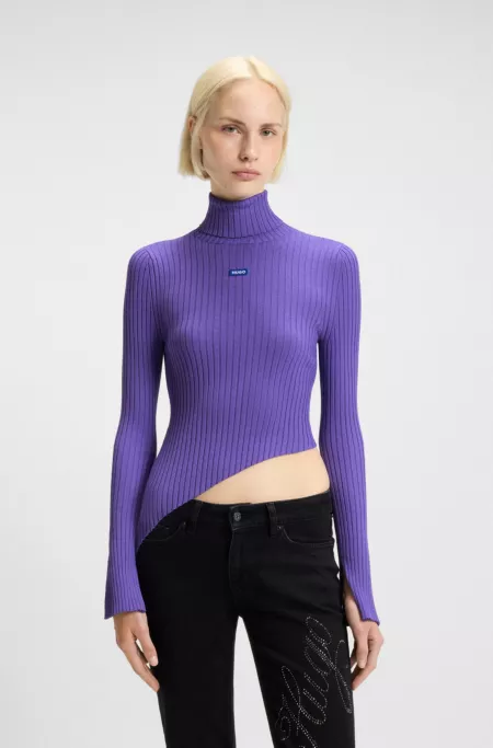 Create a variety of modern looks with this form-fitting HUGO Womenswear sweater. Rollneck profile with unique asymmetric hemline. Soft ribbed structure. Blue logo badge.