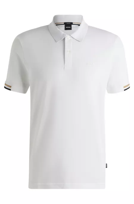 A modern polo shirt detailed with signature stripes by BOSS. Crafted in pure-cotton piqué with a mercerized finish, this short-sleeved polo shirt is trimmed with a tonal BOSS logo.
