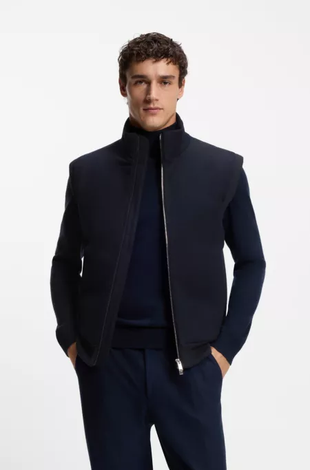 A knitted gilet in virgin wool by BOSS Menswear. This cozy design features a front panel with certified duck down-blend filling for extra warmth.