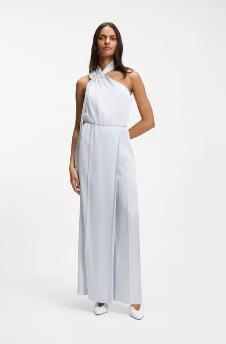 With its wrap-effect front and one-shoulder profile, this BOSS Womenswear jumpsuit strikes a modern silhouette. Crafted in lustrous fabric. Adjustable neck tie.