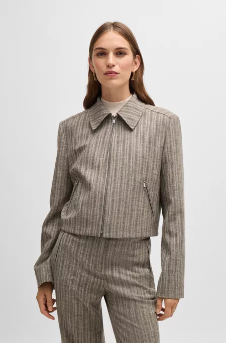 A cropped striped jacket by BOSS. Featuring a zip front, this modern piece is crafted in melange cloth, with a weighty feel, blended with wool.