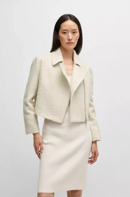 A modern jacket by BOSS, designed with an asymmetric zip. This adaptable piece is crafted in bouclé fabric blended with a touch of cotton.